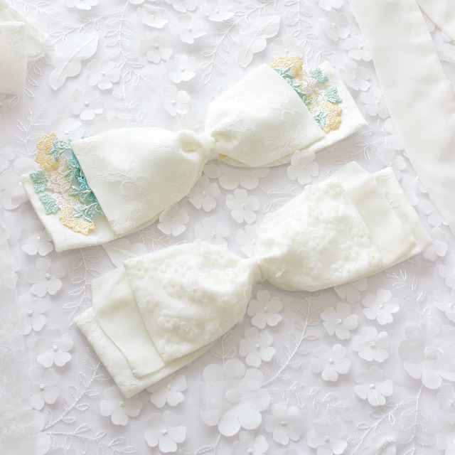 ※在庫限り販売終了です。 レース生地とモチーフレース、シフォン素材の花モチーフを組み合わせたリボン型のヘッドドレスです。 こちらはフェミニンなお洋服にはもちろん、 着物やカジュアルな服装のアイテムとしても 幅広く使えて日々の装いを楽しめるような提案を込めて作りました。 Eden;の付け襟とお揃いはもちろん、 単品でも使えるデザインにしています。 裏側にはヘアクリップがついているのでずれにくく付けやすい仕様です。 ヘアクリップは接着剤+手縫いで付けていますので 耐久性もあり長くお使いいただける仕立てにしています。 サイズ:長さ-27cm 幅-9cm 素材:レース、布-ポリエステル ヘアクリップ付き 閲覧環境により実際の商品と色合いの違いを感じることがございます。