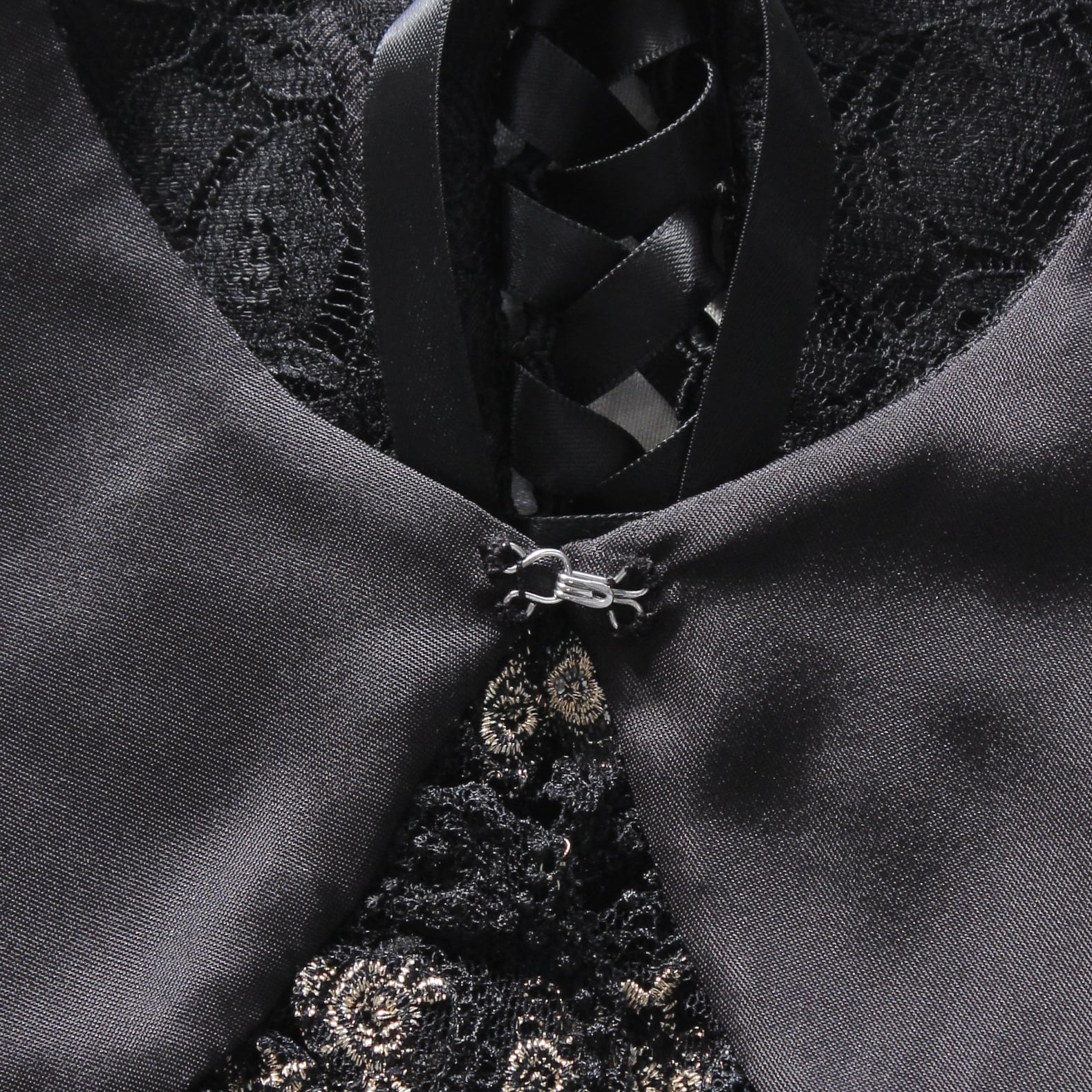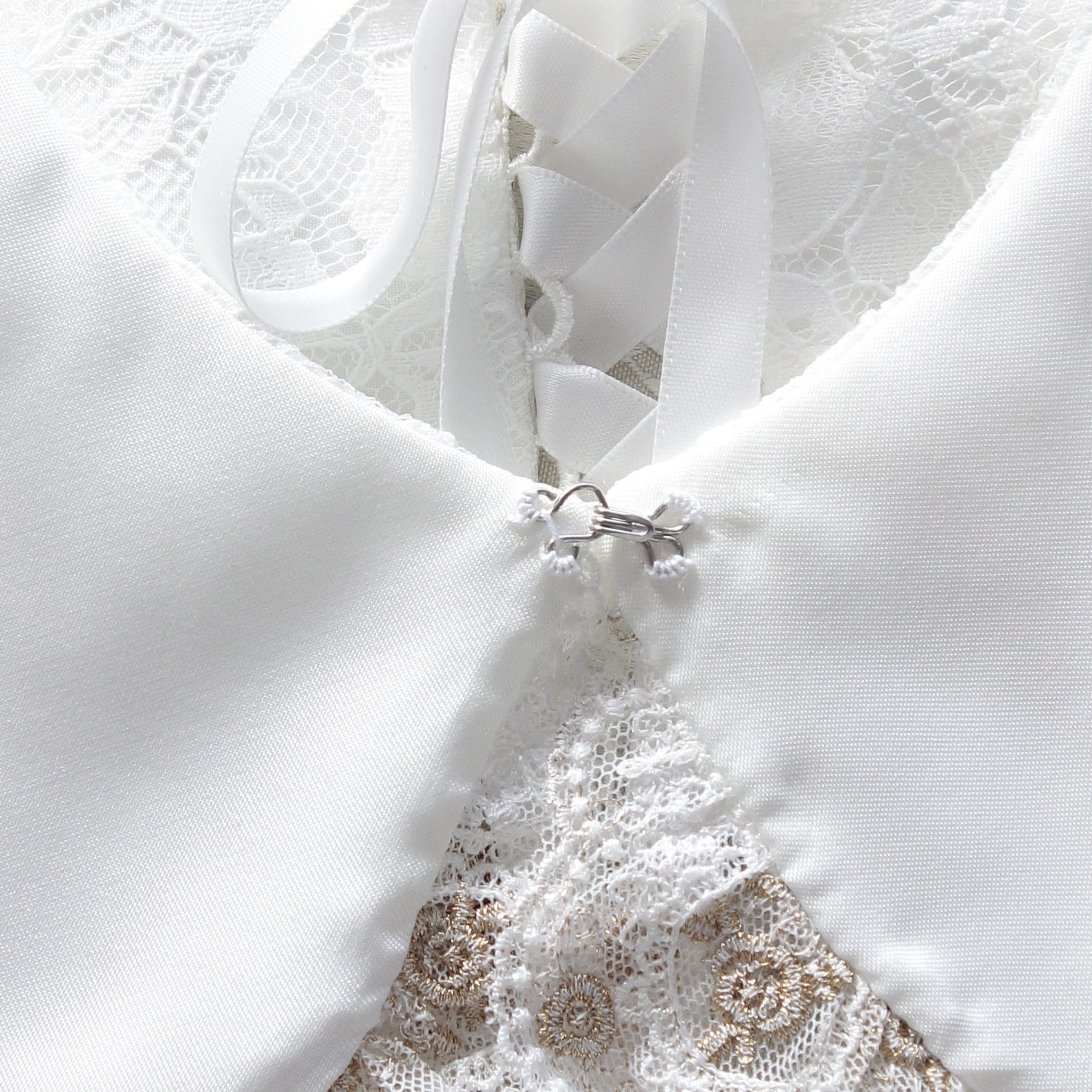 後ろのサテンリボンの編みあげで多少の首回りの調節は可能です。