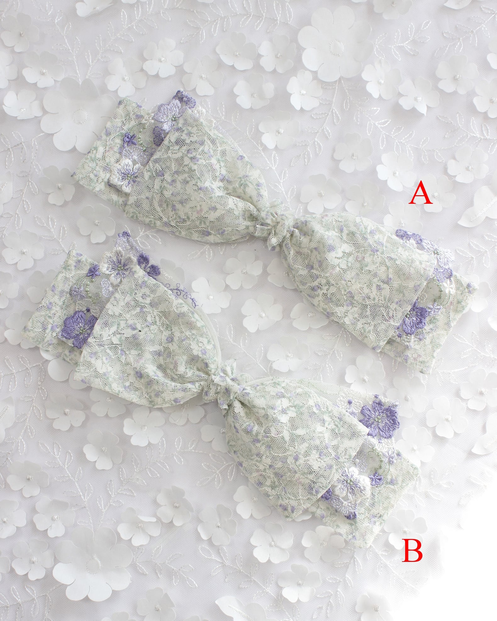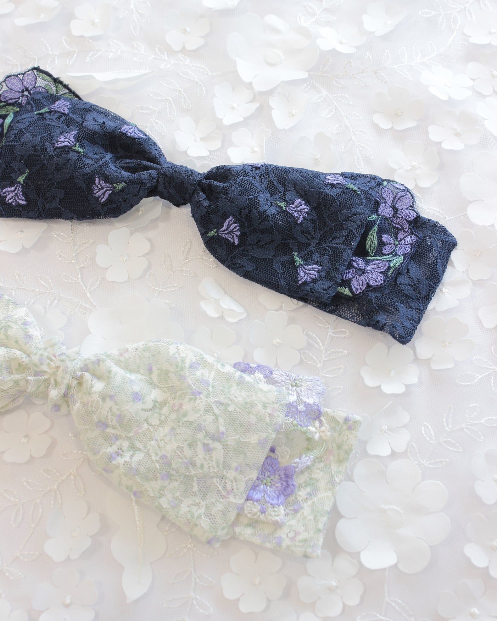 レース生地とモチーフレース、シフォン素材の花モチーフを組み合わせたリボン型のヘッドドレスです。