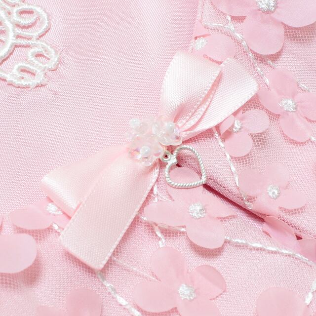 リボンの中央には透明感のあるチェコビーズの花を刺繍して塗装した白いハートモチーフが揺れています。